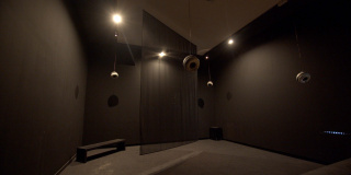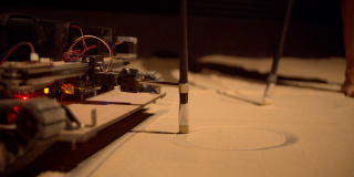 Each individual who enters into the exhibition space contributes to the work’s evolution. Emerging from a room comprising audio and visual components, visitors find themselves in the midst of a large sandbox where a robot continuously reforms the terrain while driving over and writing Hebrew letters in the sand. Custom-made tools are scattered around the sandbox, which the visitors are invited to use to reform and flatten the terrain, preparing further surfaces for the robot’s calligraphic activities. Hundreds audio recordings of vocalized Hebrew letters comprise the generative and electronically shaped soundtrack. Each vocal fragment has been composed individually, yet these gestural materials converge in continuously varying densities, forming a rich, ever-changing soundscape projected over 10 speakers in the space. Depending on their movement, visitors may hear a single whispering voice or an assemblage of vocal gestures. A live visualization of visitors’ movements inside the sandbox is projected on a large, transparent screen hung at the back of the space. This animated representation reflects the movement and interactions in the exhibition and, along with the robotic and audio components, offers a stylized perspective on the social relations occurring between individuals and within groups.