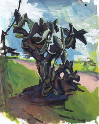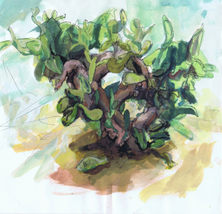 A sabra grows at the side of my family house in Kfar Yehezkel, a village in northern Israel. This large prickly pear cactus was always part of the landscape I grew up in, a silent part of my everyday existence. Without ever having consciously reflected on its presence, its form has always been intimately familiar to me. A few years ago, while visiting Israel, I suddenly became aware of its complexity and began to draw it regularly, in order to explore and understand its form. Periods of absence offered a distance that allowed me to rediscover the cactus each time anew. With each visit, the working process became more intense, more intimate, and it became clearer and clearer that I was not just creating images of a cactus, but rather that I was creating images of this cactus. It seemed to me that the sabra in its form and corporeality resembles human forms. Like a person, the cactus strives to grow tall and to brace itself against gravity. As with a human form, the cactus is made up of various limbs branching off from the main trunk, and the way the limbs connect to the trunk strongly resembles human joints.