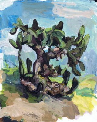 The various angles of the limbs and trunk create the illusion of human gesture, of frozen movement. The human struggle to oppose gravity is embodied in excessive form in a cactus. Just as we build strength to oppose the downward pull of gravity, the lower branches and trunk of the sabra gradually build strength to support the younger branches, themselves struggling to climb ever higher. Nevertheless, the weight eventually proves to be too much for the mother plant to bear and branches split and fall to the ground. Each branch forms new roots where it landed and eventually develops into a new cactus. The sabra motive is a symbol that is laden with multiple meanings in Israeli-Palestinian political discourse. Found throughout the dry regions in Israel, the plant is able to survive on very little, and parts of the plant that break off and fall from the main trunk form new roots wherever they land.