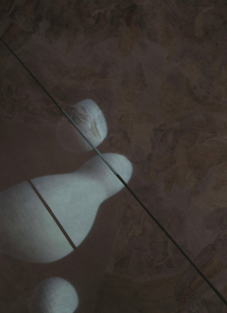 The installation comprised three projectors, each assigned one of three different visualizations that are projected on three large, transparent black screens hung in the exhibition space. This approach is a direct outgrowth of practices in recent works exploring the layering of materials and using transparency and light as artistic materials. The projected images were thus visible from both sides as well as beyond the screens on the frescoed walls of Casa Paganini’s auditorium.
