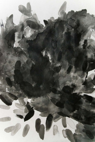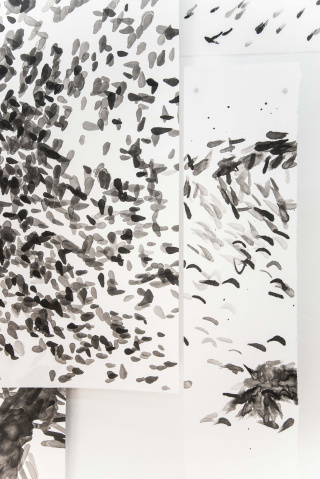What could have been executed as one painting constructed of thousands of brushstrokes has instead been decomposed and distributed over numerous sheets of rice paper. Different sections of the master particle generator image were cropped and the individual particles were translated into single brushstrokes (assigning parameters such as, for example, the size, length, pressure and speed variation of the strokes), before the data was sent to the robot for the final execution.