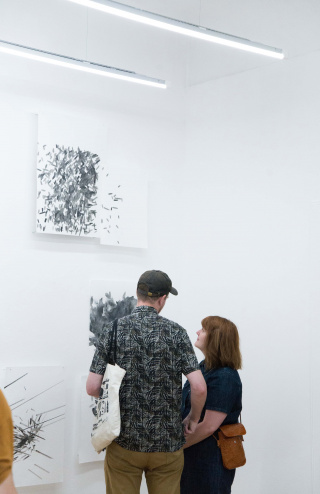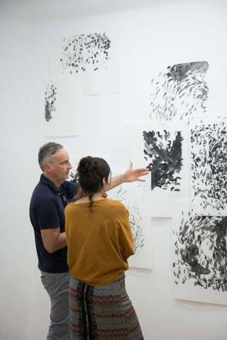 The individual paper works are extracted from a complex of computer-generated particles (Simulation of a World Overview, 2018) according to Newton’s Law of Universal Gravitation. Scaled to different sizes, each can be viewed not only as an individual work but also as part of the modular wall installation. Nebe’s video compositions utilize close-up footage he made of the ink and paper interacting as Grayver created the works manually, offering intriguing temporal perspectives on the material’s response and impact on the act of painting.
