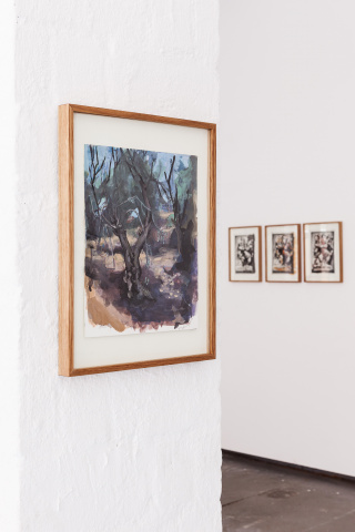 Looking for a platform to articulate human gesture, I noticed this tree on the Saale river bank in Jena while participating in the Plenair residency programme in Jena. Over the course of a week, I made several paintings and drawings of its form. This particular tree, in its almost ornately moving form, seems to me like the shape of an Indian temple dancer, an association that I have taken as inspiration.